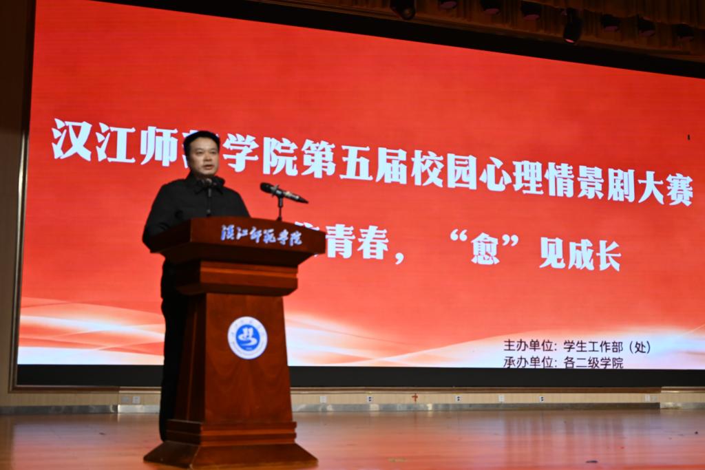 2025年12月21日,汉江师范学院第五届校园心理情景剧大赛决赛在南风剧场精彩上演。本次大赛由学生工作部(处)主办、各二级学院协办,以“‘剧’焦青春,‘愈’见成长”为主题, 大赛特邀学生工作部部长赵盛国、副部长张香武,国药茅箭东风医院心理科郑彩霞医师,教育学院郑航月、郭晨凌、陈婷婷老师及心理健康教育中心王晓敏老师组建专业评审委员会,与现场师生共同见证这场直击心灵的心理主题展演。